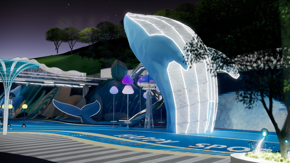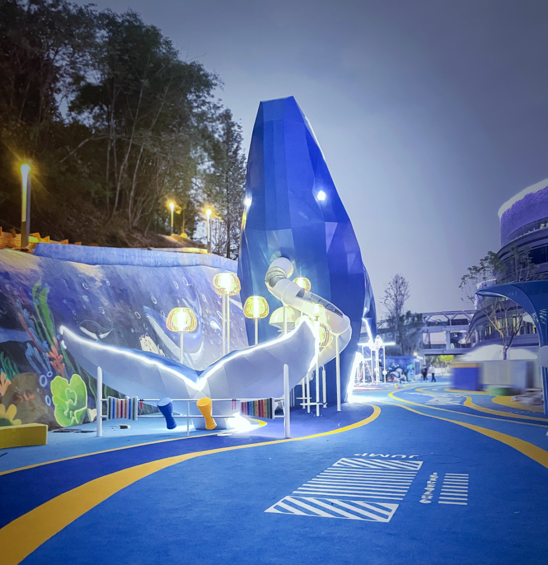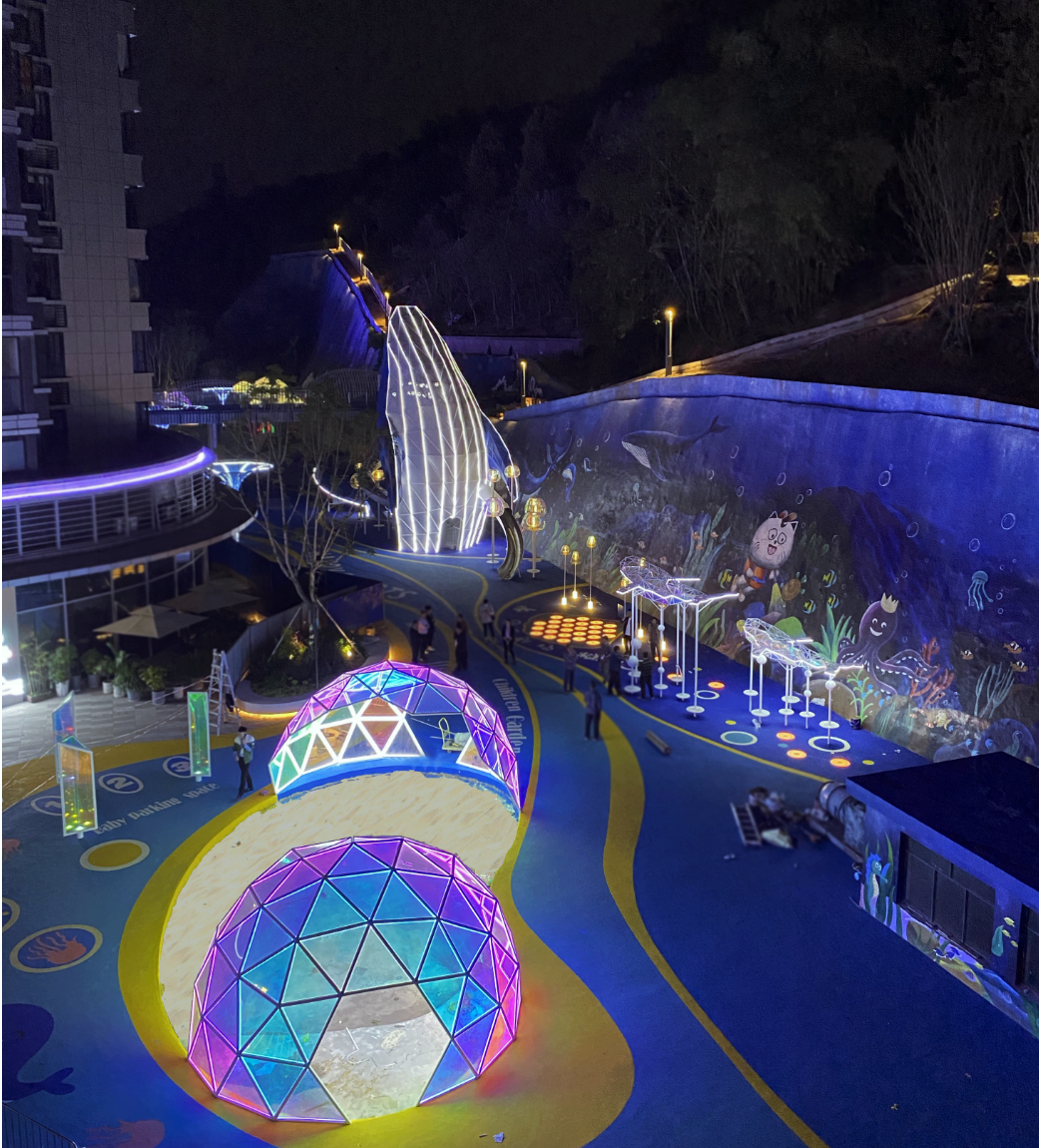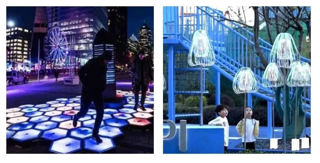 作为商业街活动空间,夜景效果更为重要。因此我们引入了部分互动设施,来提升夜间游乐体验。