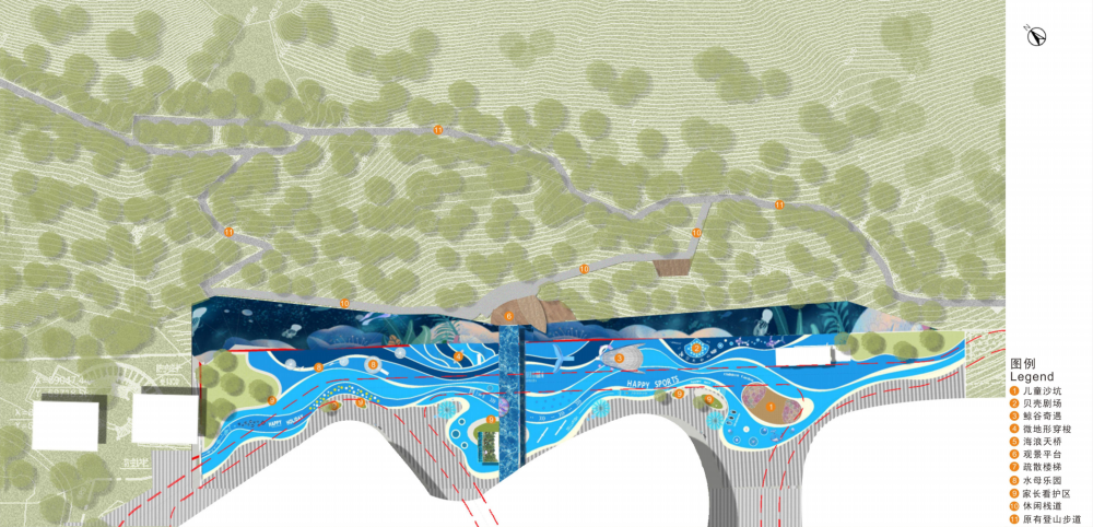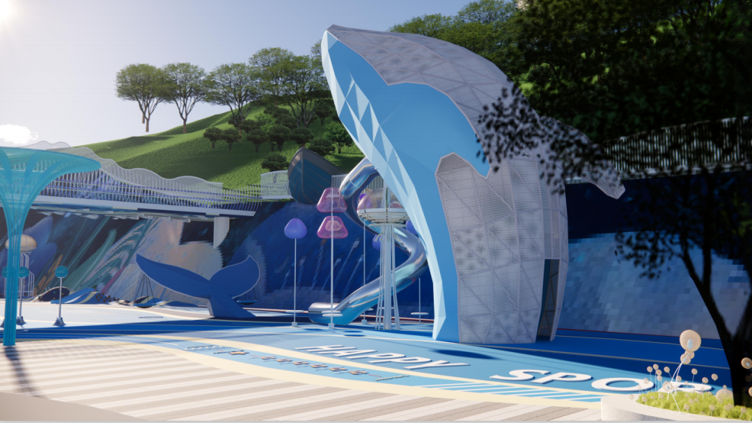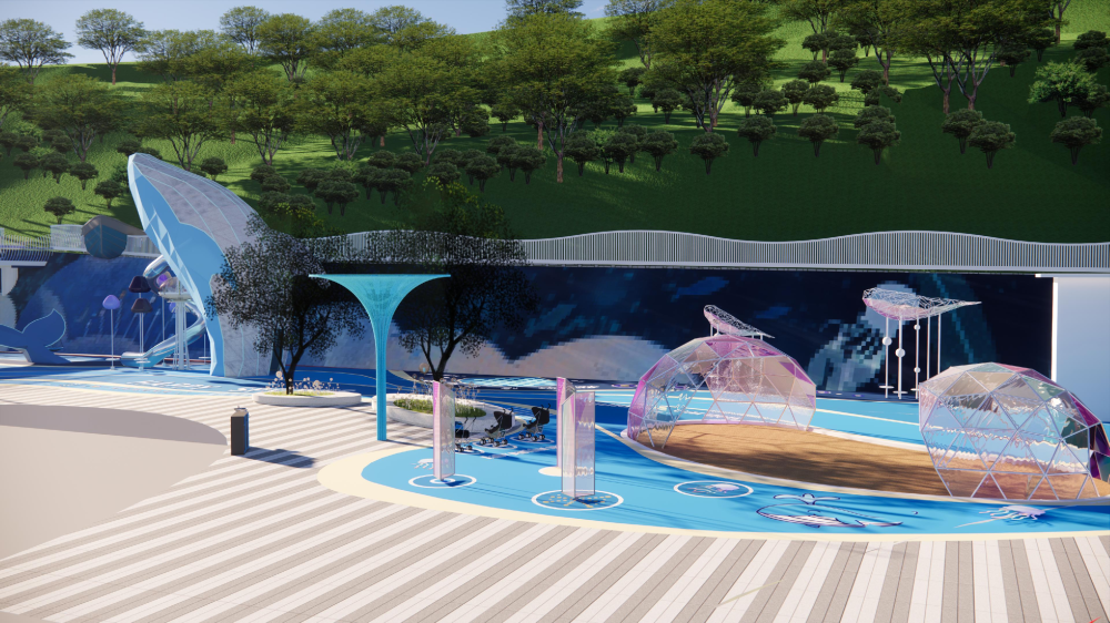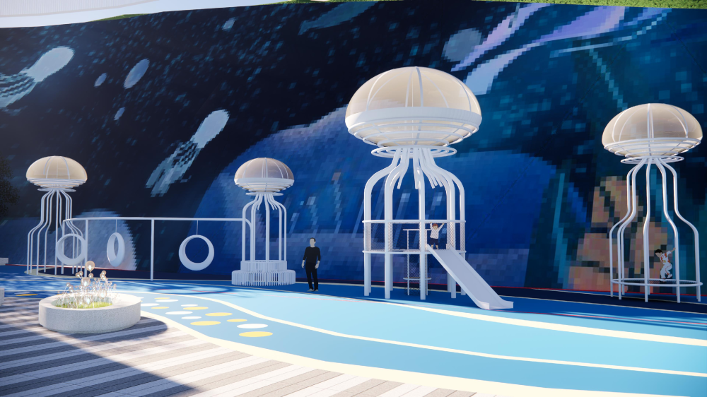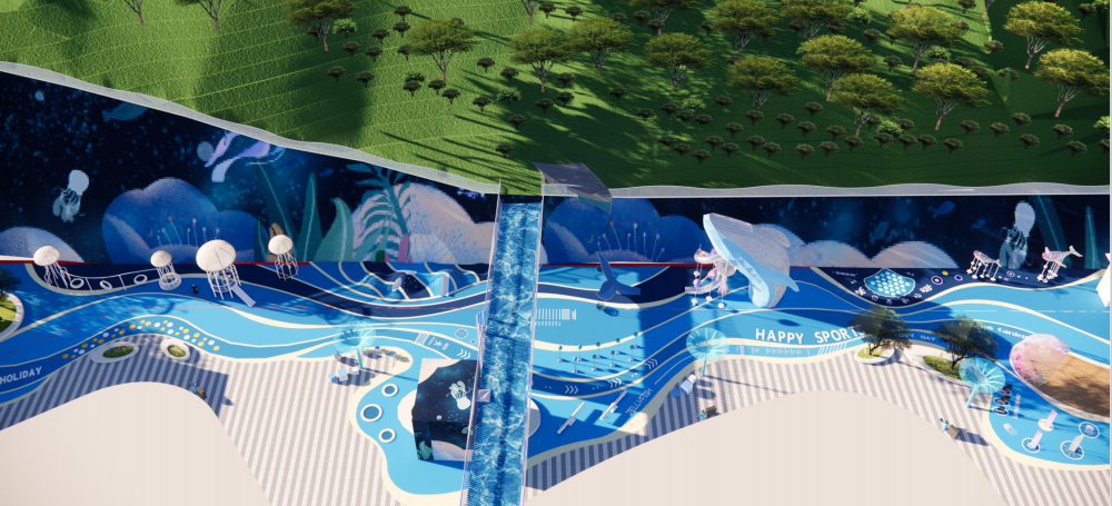 如何有效利用场地特性营造令人印象深刻的游乐空间,分析场地时,起伏的边坡让人联想到了绵延的海岸线,将空间分为陆上绿地及海底世界。