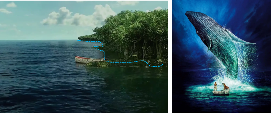 水面跃起了一只鲸鱼,带起好多小水母,极具动感的打破空间层次,与海面上的船只形成互动