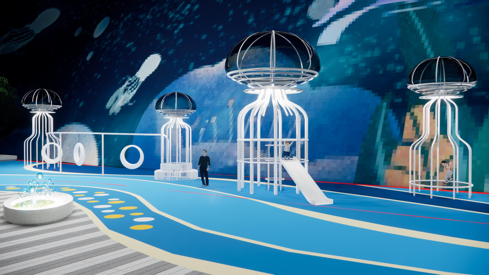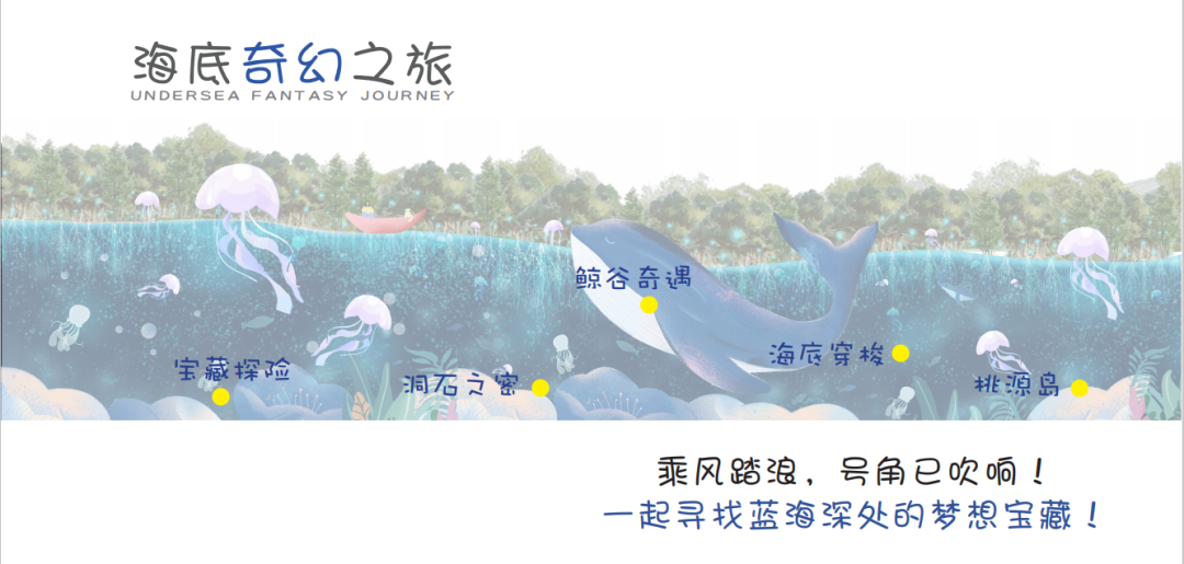 怎样将上下空间巧妙的联系起来,设计师们想到了《少年派的奇幻漂流》里各种梦幻的场景,鲸鱼跃出水面带着满身星光跨越小船的画面令人惊叹不已。于是场地以海底奇幻之旅为主题,开启一段海底寻宝探险之旅。