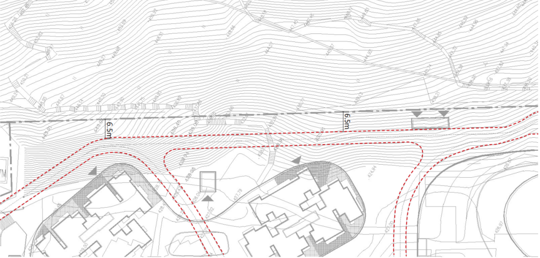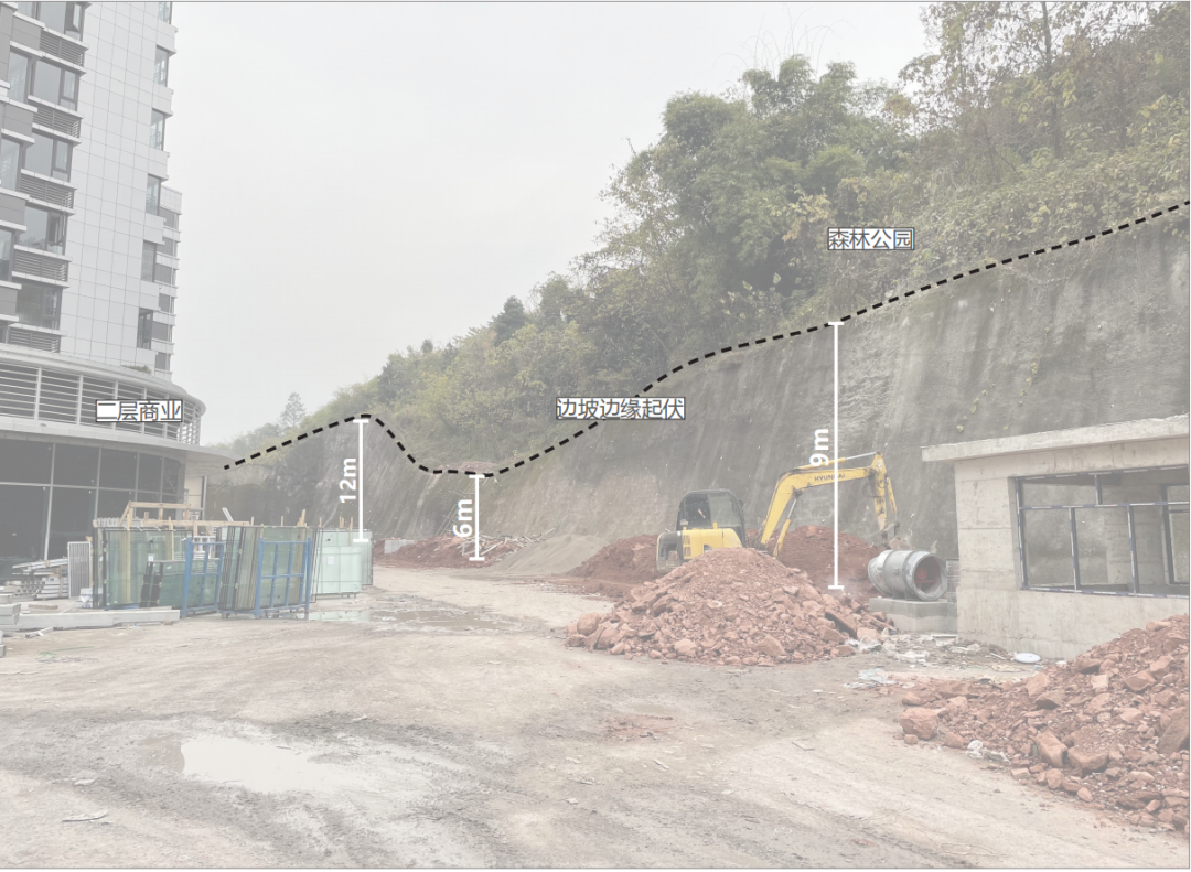 ▽场地一侧是公园高边坡,商业一侧是商业住宅